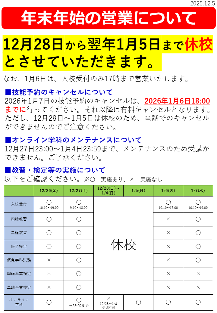 ※スクールバスは、12/28~1/6まで運休とさせていただきます。